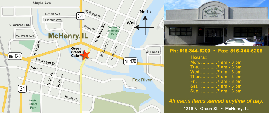 815-344-5200 Great food, excellent prices and family dining every day of the year! Dine In or Carry Out! FREE Wi-Fi internet connection so you can Eat, Work and Network at Green Street Cafe! © 2011 - 2026, Green Street Cafe Note: Prices subject to change. |